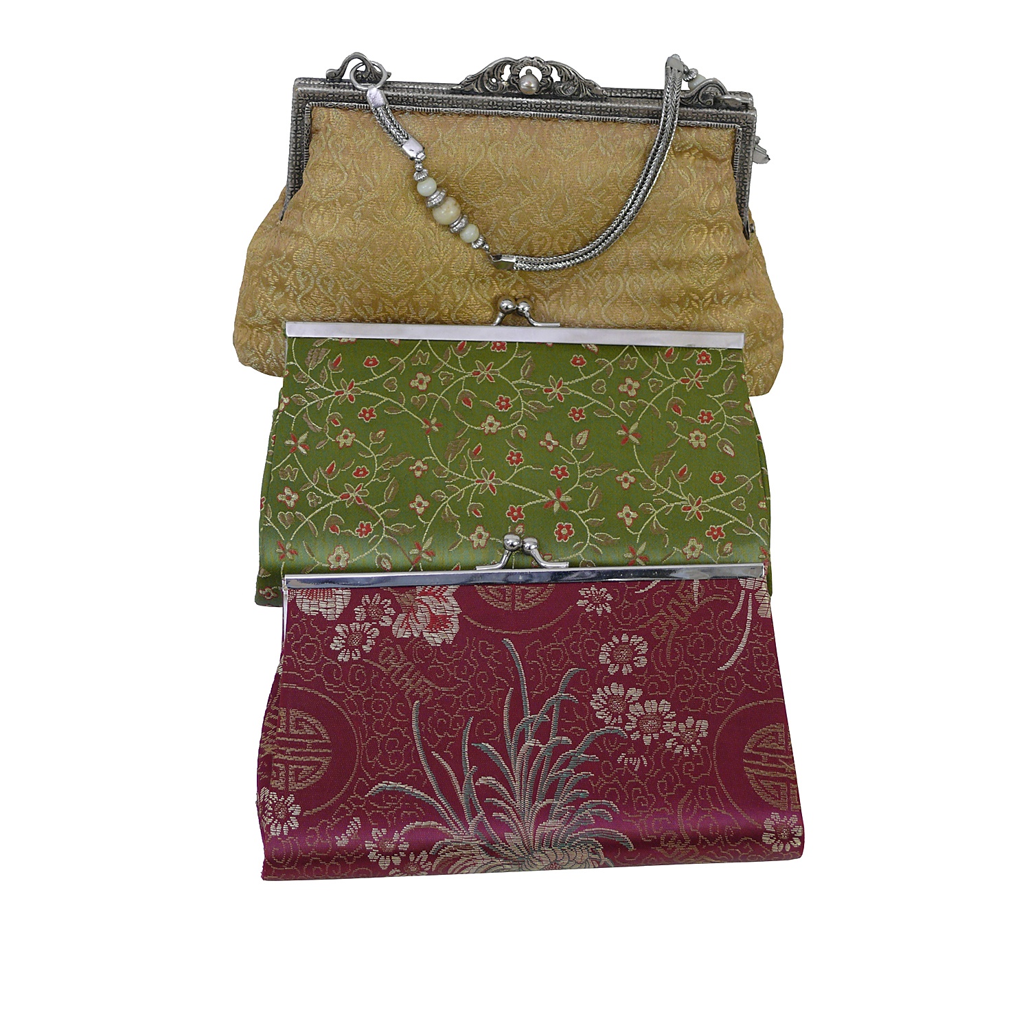 WOVEN FLORAL SATIN HANDBAG WITH METAL FRAME AND CHAIN STRAP AS LISTED (X3)