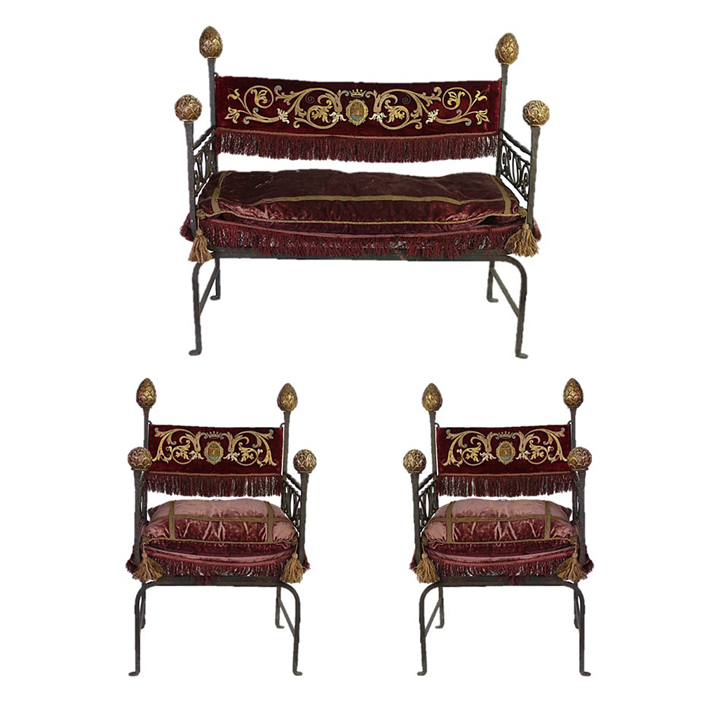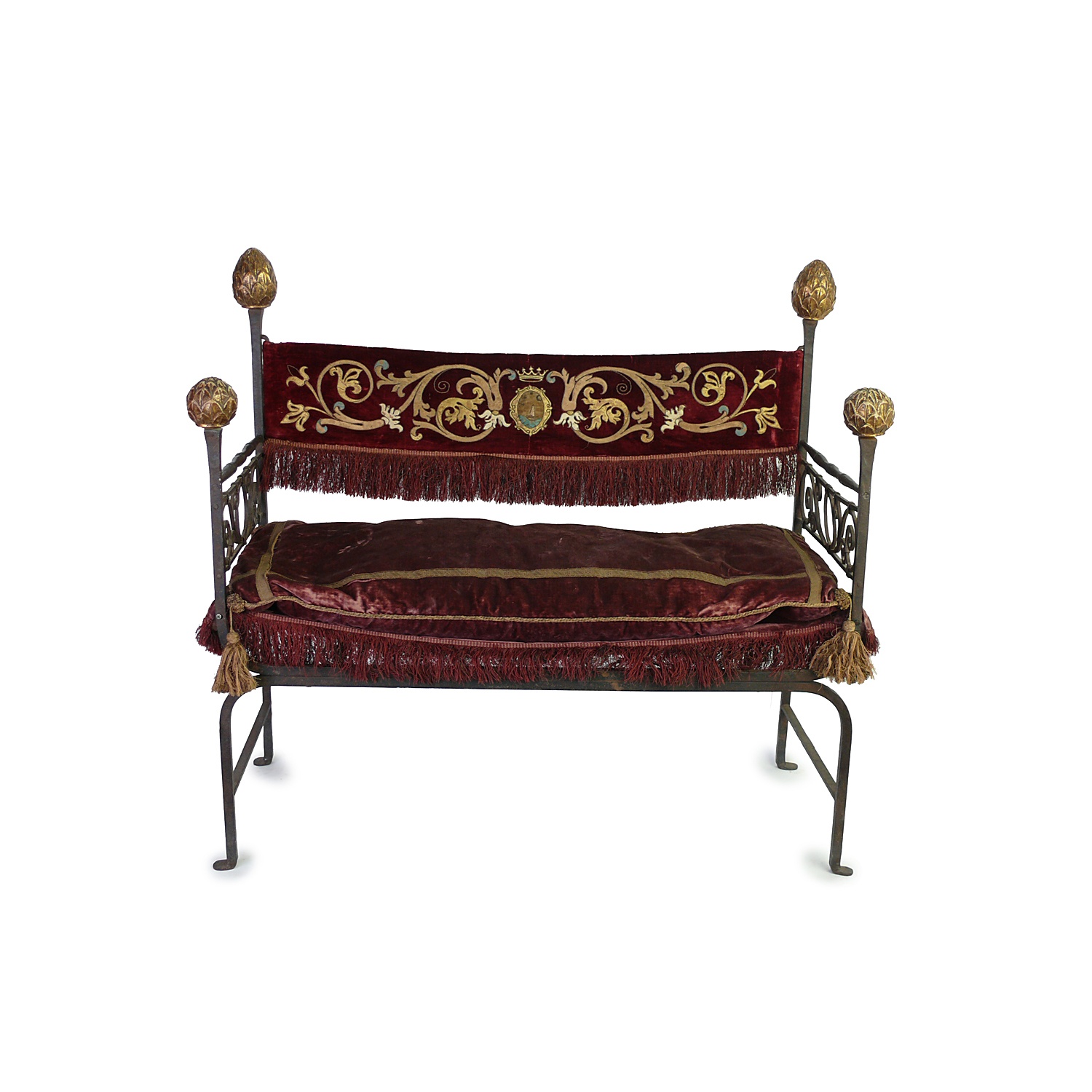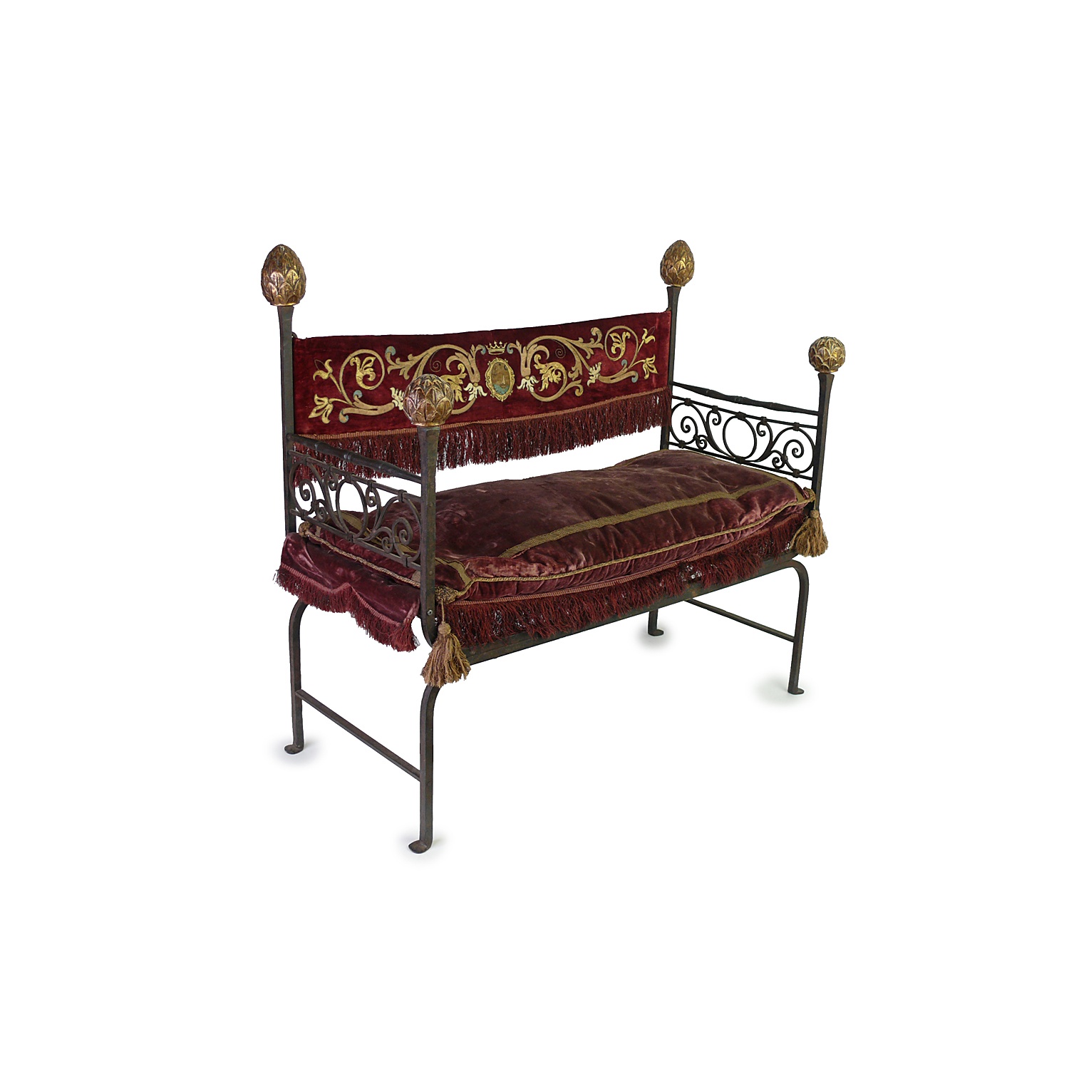 WROUGHT IRON ARM CHAIR MARQUISE / SOFA RED APPLIQUE VELVET ITALIAN 16TH CENT STYLE 96 CM HIGH 105 CM WIDE 50 CM DEEP