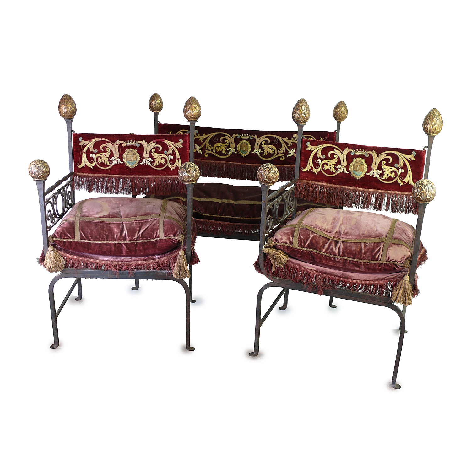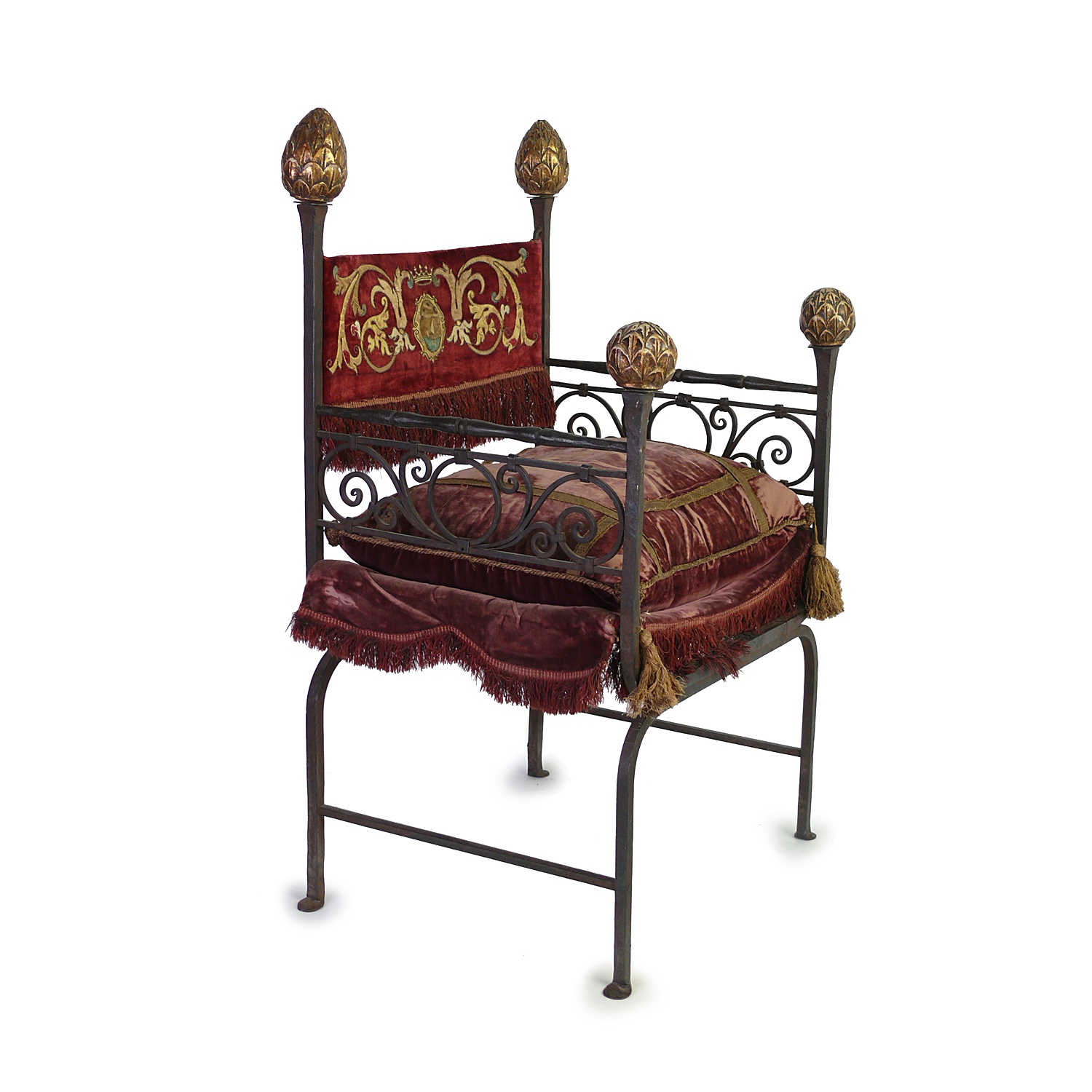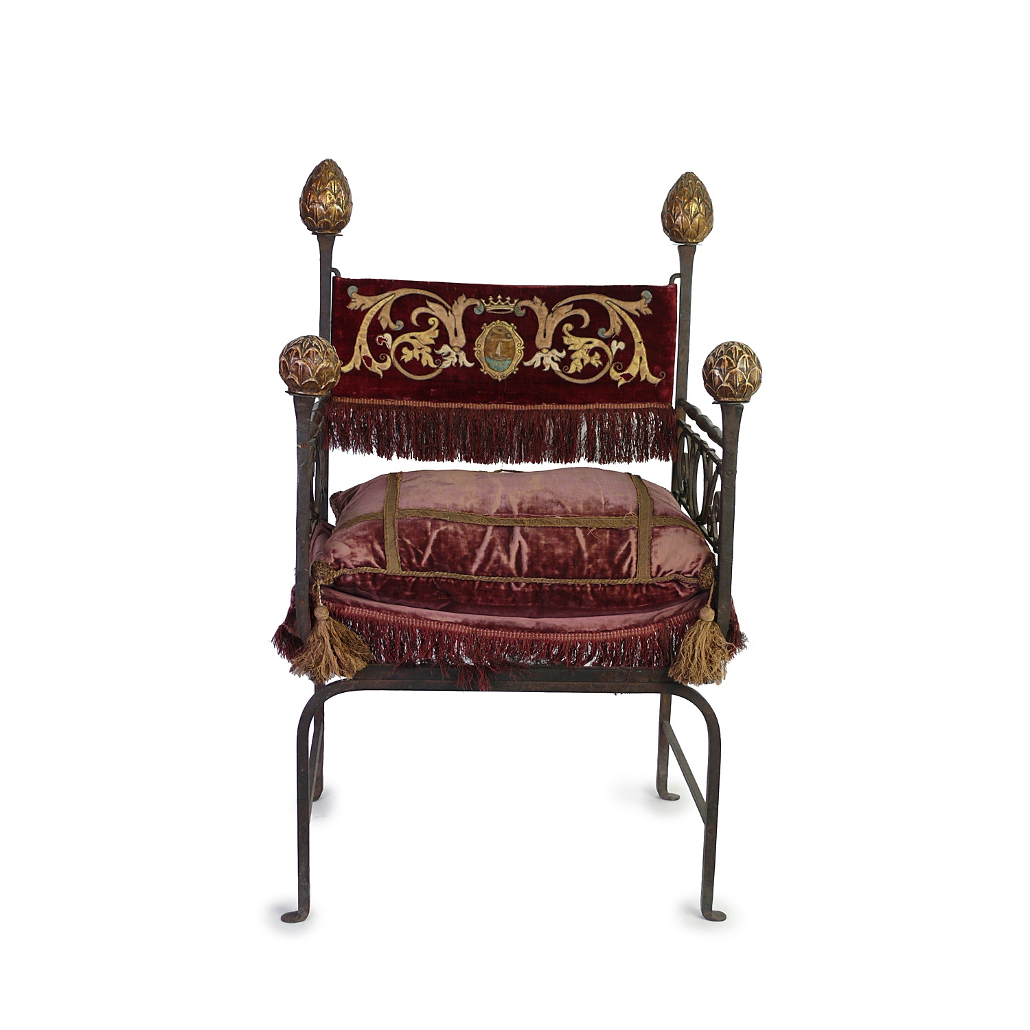 WROUGHT IRON ELBOW CHAIR WITH RED APPLIQUE VELVET UPHOLSTERY AND GILT WOOD FINIALS ITALIAN 16TH CENT STYLE 98 CM HIGH 81 CM WIDE 50 CM DEEP (X2)