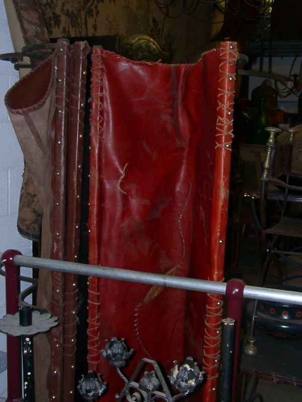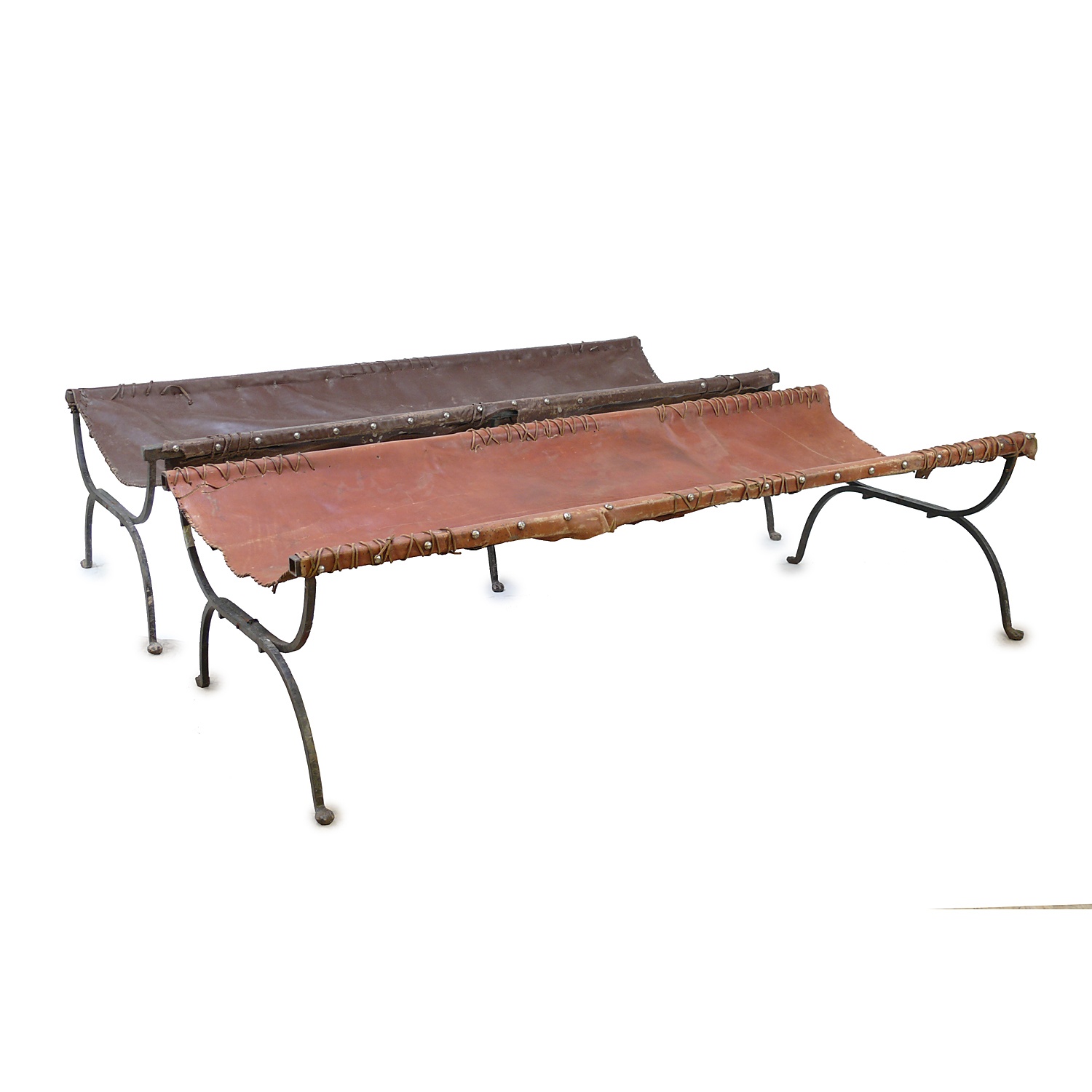 WROUGHT IRON FOLDING CAMPAIGN BED / STOOL WITH BURGUNDY LEATHER SLUNG SEAT SIX LION PAW FEET (X2)