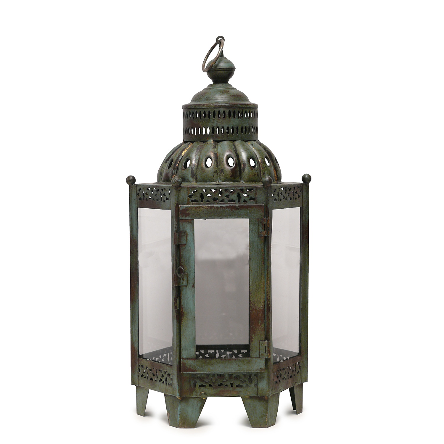 WROUGHT IRON LANTERN HEXAGONAL WITH DISTRESSED GREEN FINISH AND DOMED TOP 60 CM HIGH (X15)