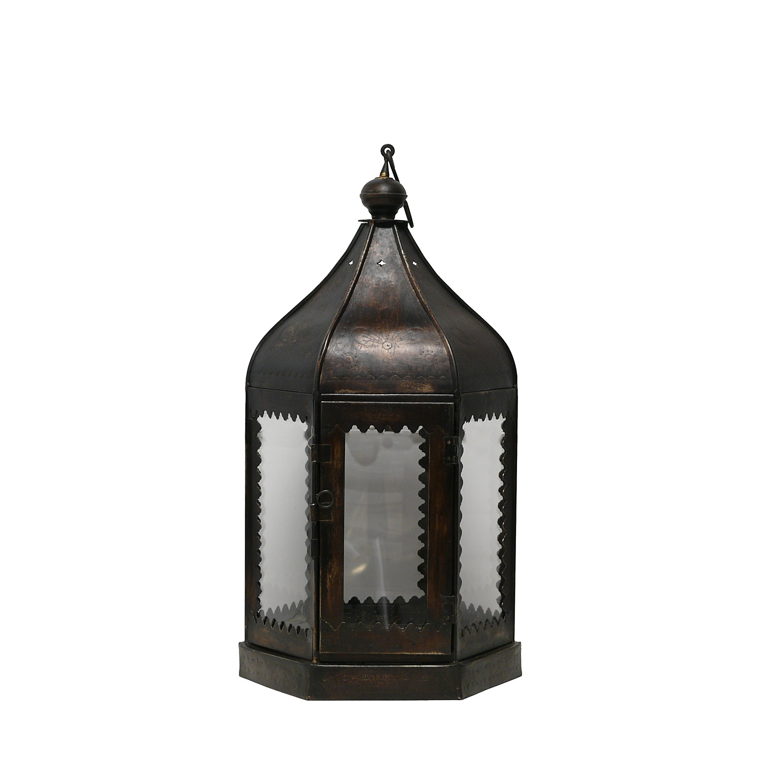 WROUGHT IRON LANTERN WITH HEXAGONAL WITH FRILL EDGE TO GLASS PANELS AND PAGODA TOP 56 CM HIGH (X13)